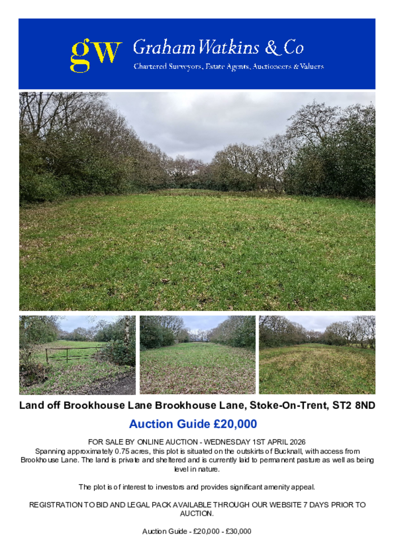 Spanning approximately 0.75 acres, this plot is situated on the outskirts of Bucknall, with access from Brookhouse Lane. The land is private and sheltered and is currently laid to permanent pasture as well as being level in nature.